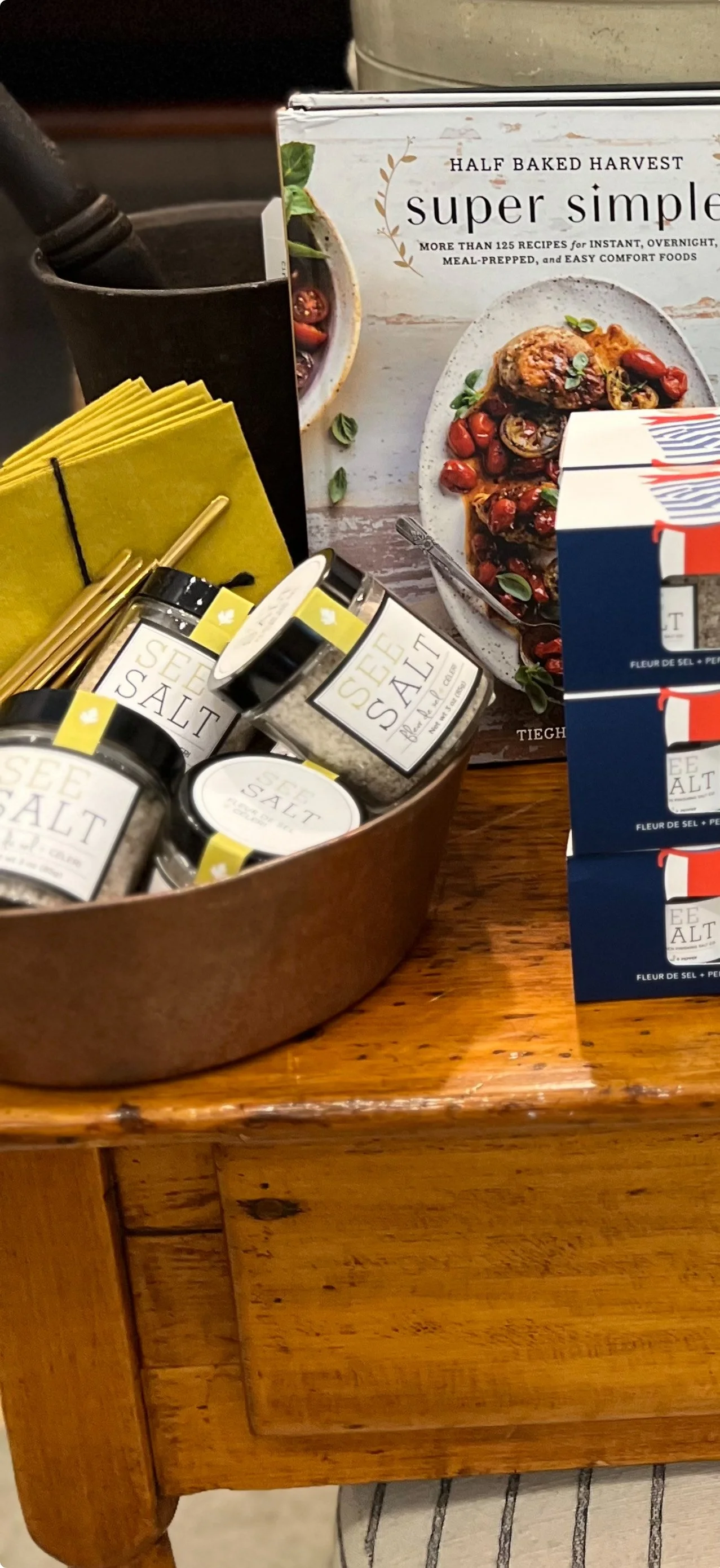 Small inexpensive items like lip gloss, jarred salts or candles in tins. Most of them come in hideous little boxes that you put out on your counters, why not take them out of the box and find a pretty candy dish or interesting bowl? Instantly the little inexpensive items look more important, it looks pretty and you have given it more value instantly.
